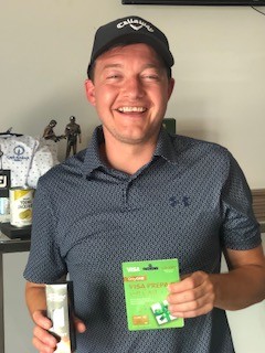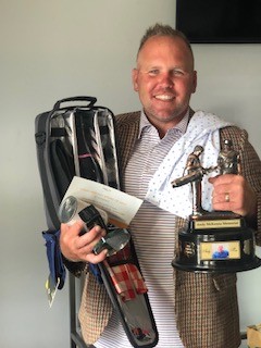 2nd placed Tommy collecting a $150 visa card, hat and sleave of Pro V1.