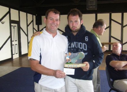 First off the tee would be the dead gallas Dave, armed with his ‘official internet printout’ hanging out his top pocket, with the digits of 2 and 3 highlighted for all to see. This lack of self confidence from the team captain was to have a profound effect on his teammate Hughesy, who along with the windy conditions, just didn’t have it in him to turn the team around. A net score of 77.25 was the best this deadly duo could muster. So it would that familiar re-union, as Dave was to step onto the NAGA dais yet again and return the ‘old man’ to the familiar surroundings of Dave’s mantelpiece for another month, at least.